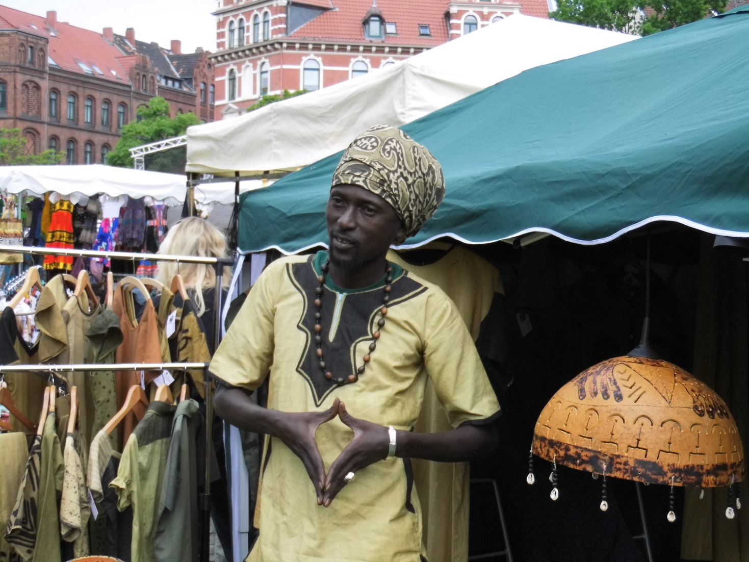 Händler bieten eine Vielfalt von Stoffen, von Seide aus Indien bis zu handgewebtem Leinen aus Mali, Gewürze duften verheißungsvoll und allerlei Schmuck und Gewerk von Silberschmuck aus Marokko bis zu Lampen aus Ägypten, wird zum Kauf geboten. Die Waren stammen aus dem arabischen Raum und vom afrikanischen Kontinent. Alle Waren transportieren ein Stück ihrer Geschichte und haben teils große Entfernungen mit der KARAWANE zurückgelegt. Das Stöbern und Feilschen lohnt sich also gewiss.